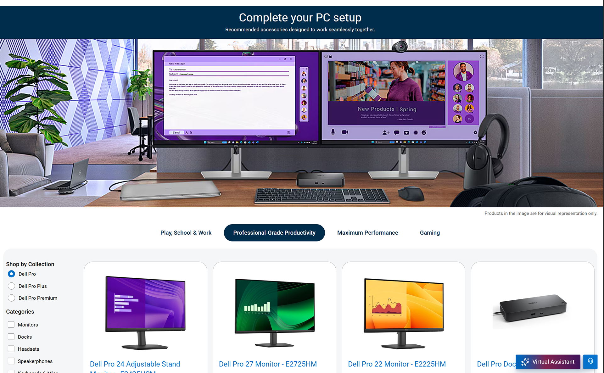 For this project, we developed product ecosystems for the accessories page on Dell’s website. The goal was to create distinct setups for home, office, co-working spaces, and coffee shops, each designed with entry, mid level, and premium options. We assigned a color from our brand palette to each setup, with overall colors progressing from light to dark as they became more premium.